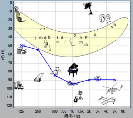 左耳(藍(lán)色X):低頻聽力正常逐步過渡到高頻重度聽力受損。