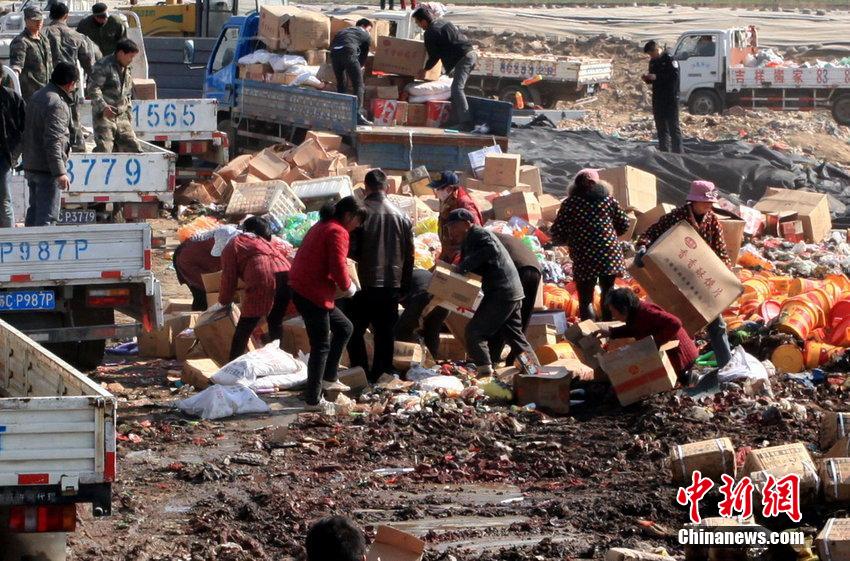 下午3時(shí)許,現(xiàn)場(chǎng)的銷毀行動(dòng)干得熱火朝天,令人沒想到的事情發(fā)生了。記者在現(xiàn)場(chǎng)看到,附近一些村民配備了鐵鉤、編織袋、竹筐等工 具,待銷毀商品一卸下,這些人立即上前哄搶。執(zhí)法人員極力制止,但仍有人帶走了一些。幾位婦女趁混亂抱走幾箱假冒豆奶粉和味精抬放到空地上后,又跑回來繼 續(xù)哄搶。記者問是否知道這些假冒偽劣商品的危害,她們說,知道一點(diǎn)。記者問,既然知道,為何還要哄搶?她們中大多人不說話,兩人笑著說拿回家看看,不能吃 就喂豬。
